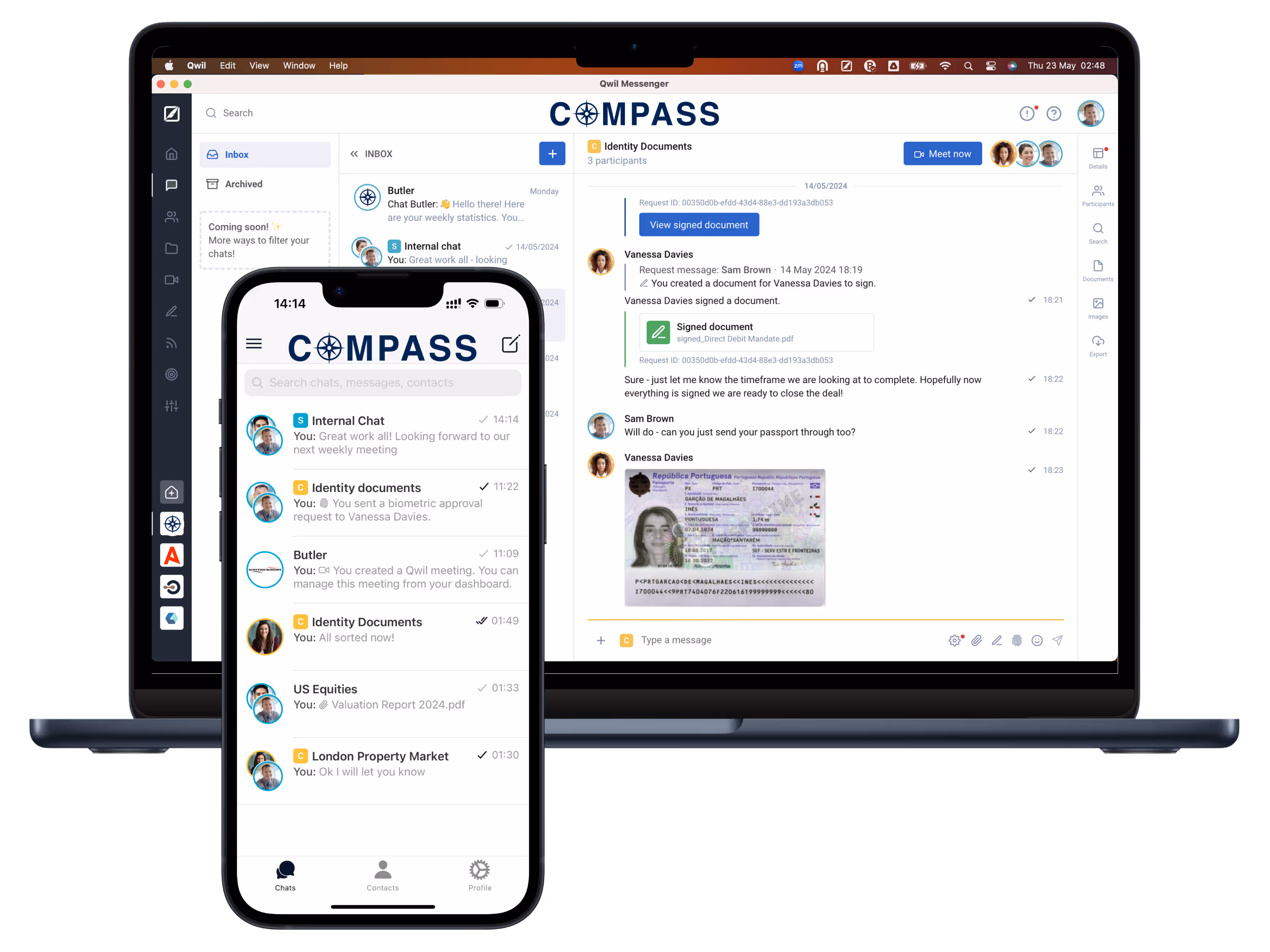 Qwil gives you WhatsApp-style ease, but in a fully secure, compliant environment. You get fast, emoji-filled conversations with drag-and-drop file sharing — plus professional features like e-signatures, video calls, scheduling, and file management, all in one place.