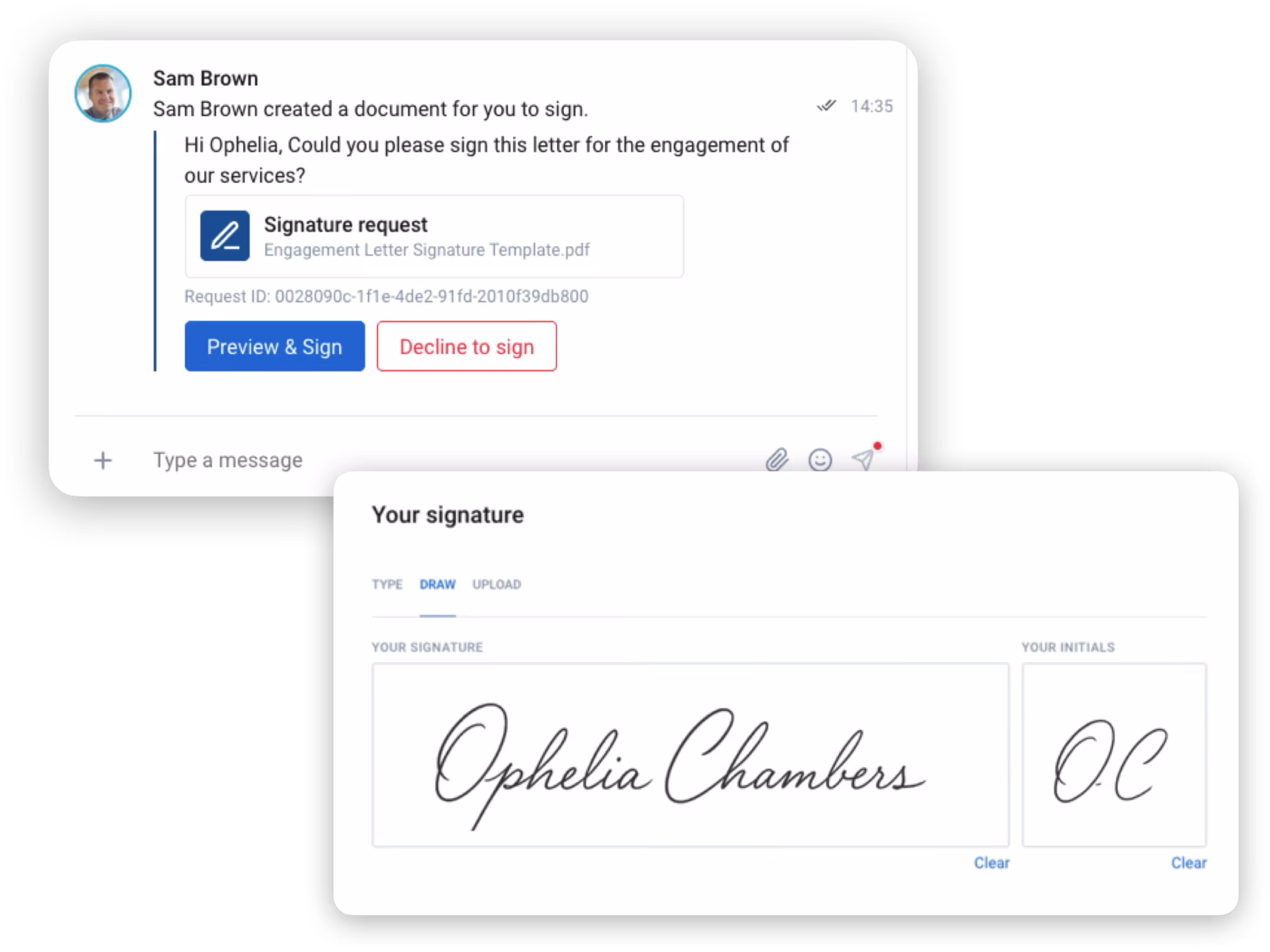 Request signatures and sign documents directly within chat threads.